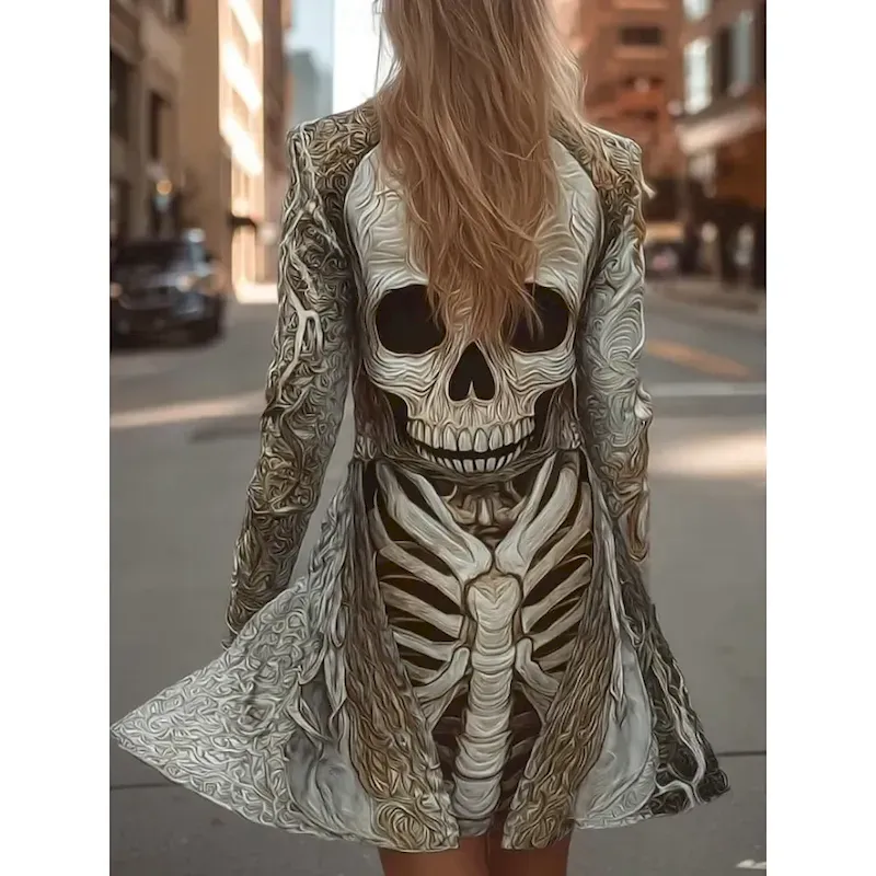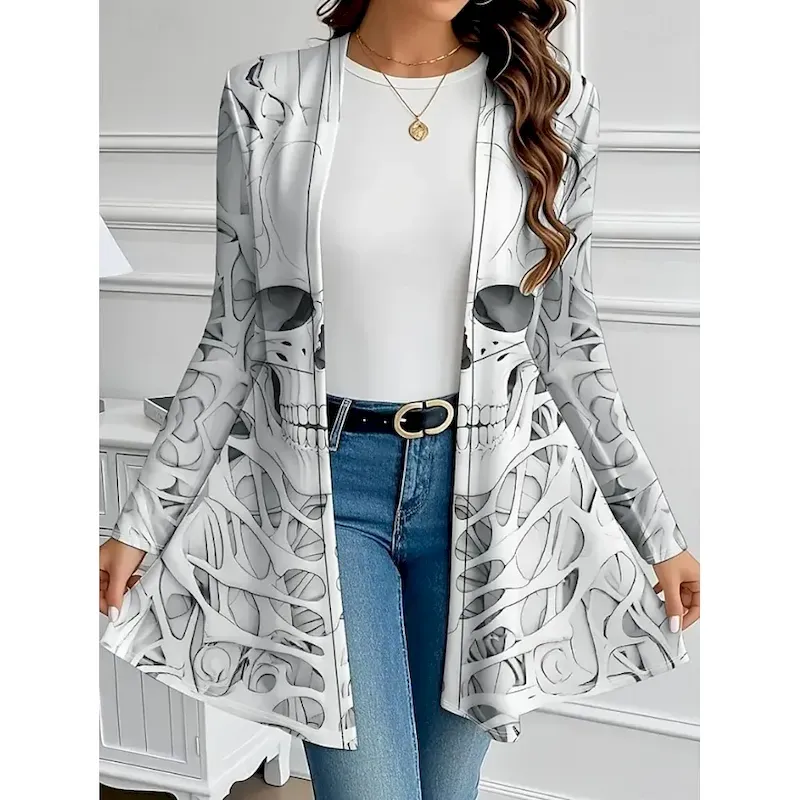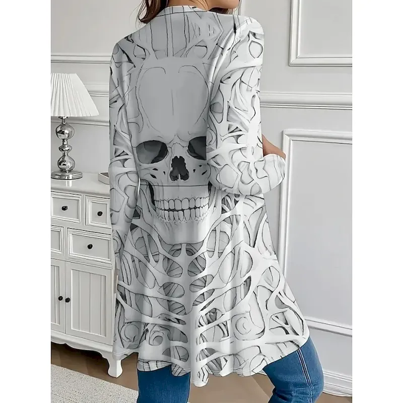 Halloween Women’s Coat Lightweight Comfortable Skulls Print Vintage Artistic Casual Skull Casual Long Collarless Regular Fit Long Sleeve Outerwear Black Dark Grey Spring Fall
