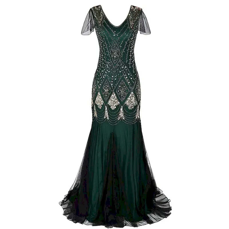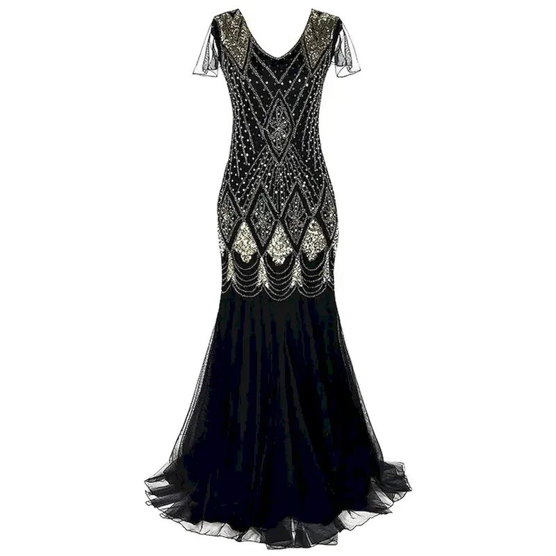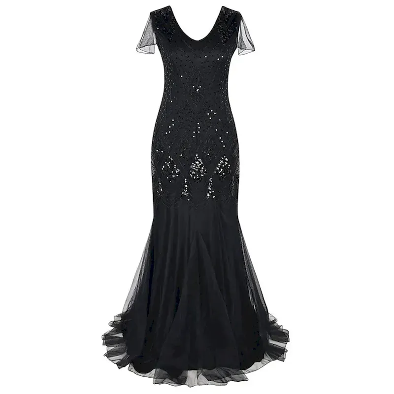 [Fabric] This stunning dress is crafted from high-quality polyester, offering a luxurious feel and micro-elastic fit. The blend of tulle and mesh creates a delicate, sheer overlay that adds to the dress’s elegance.[Fit] The dress features a bodycon design that beautifully hugs the body’s curves, complemented by a long, flowing hem that adds grace to your every step. Its micro-elastic properties ensure a comfortable fit without compromising on style.[Design Highlights] Inspired by Art Deco, the dress boasts intricate beadwork and geometric patterns that exude vintage charm. The sleeveless style and V-neckline bring a modern touch, while the sequin details and sheer mesh offer a glamorous and sophisticated flair.[Occasions] Perfect for cocktail parties, evening events, and special occasions, this dress radiates timeless elegance. Whether you’re attending a formal gathering or celebrating a special night out, it ensures you make a memorable impression.[Size Range] Available in a variety of colors, including Burgundy, Gold, Black, Apricot, Dark Green, and Blue Black, the dress comes in sizes S, M, L, XL, 2XL, and 3XL to cater to a range of preferences and body types, ensuring the perfect fit for your event.OK