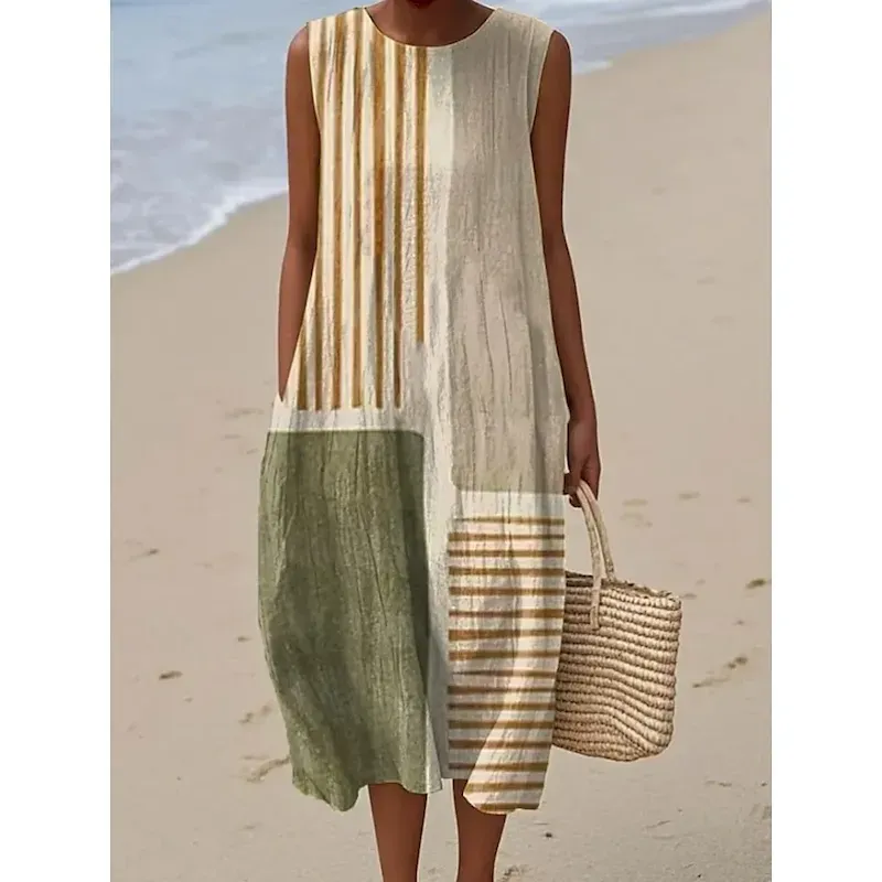 1.Dresses Type: Sundress2.Fabric: Polyester3.Gender: Women’s4.Design: Patchwork Print5.Style: Casual Boho6.Dress Length Type: Midi Dress7.Sleeve Length: Sleeveless8.Pattern: Floral9.Season: Spring Summer